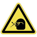 PET樹脂製の警告ラベルです。表面はラミネート加工です。三角形のシンプルな注意表示です。