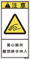 TOP中国語ラベル (繁体) はさまれ Sサイズ (61×31) ZH-132-S 挟まれ(61×31) 価格: ¥160 (税込 ¥176) 販売期間: 型番: ZH-132-S 数量: 枚 在庫 在庫あり 日本語訳 挟み込み注意手を入れるな 商品説明 PET樹脂製の警告ラベルです。表面はラミネート加工です。 商品仕様 製品名: 警告ラベル 繁体語 型番: ZH-132-S 外寸法: 幅31mm × 高さ61mm 製品重量: 1g