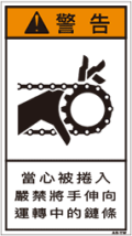 TOP中国語ラベル (繁体) 巻き込まれ Mサイズ (90×50) ZH-201-M 巻込まれ(90×50) 価格: ¥210 (税込 ¥231) 販売期間: 型番: ZH-201-M 数量: 枚 在庫 在庫あり 日本語訳 巻き込まれ注意回転中のチェーンに手を出すな 商品説明 PET樹脂製の警告ラベルです。表面はラミネート加工です。 商品仕様 製品名: 警告ラベル 繁体語 型番: ZH-201-M 外寸法: 幅50mm × 高さ90mm 製品重量: 2g ・RoHS(10種)対応 / REACH対応 ・屋外/屋内対応 ・スクリーン印刷 ・耐熱性 -20℃〜80℃ ・耐油性 ギヤ油72時間変化なし ・耐候性 ウェザーメーター 400時間変化なし