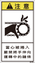 TOP中国語ラベル (繁体) 巻き込まれ Mサイズ (90×50) ZH-211-M 巻込まれ(90×50) 価格: ¥210 (税込 ¥231) 販売期間: 型番: ZH-211-M 数量: 枚 在庫 在庫あり 日本語訳 巻き込まれ注意回転中のチェーンに手を出すな 商品説明 PET樹脂製の警告ラベルです。表面はラミネート加工です。 商品仕様 製品名: 警告ラベル 繁体語 型番: ZH-211-M 外寸法: 幅50mm × 高さ90mm 製品重量: 2g ・RoHS(10種)対応 / REACH対応 ・屋外/屋内対応 ・スクリーン印刷 ・耐熱性 -20℃〜80℃ ・耐油性 ギヤ油72時間変化なし ・耐候性 ウェザーメーター 400時間変化なし