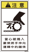 TOP中国語ラベル (繁体) 巻き込まれ Mサイズ (90×50) ZH-2111-M 巻込まれ(90×50) 価格: ¥210 (税込 ¥231) 販売期間: 型番: ZH-2111-M 数量: 枚 在庫 在庫あり 日本語訳 巻き込まれ注意回転中のチェーンに手を出すな 商品説明 PET樹脂製の警告ラベルです。表面はラミネート加工です。 商品仕様 製品名: 警告ラベル 繁体語 型番: ZH-2111-M 外寸法: 幅50mm × 高さ90mm 製品重量: 2g ・RoHS(10種)対応 / REACH対応 ・屋外/屋内対応 ・スクリーン印刷 ・耐熱性 -20℃〜80℃ ・耐油性 ギヤ油72時間変化なし ・耐候性 ウェザーメーター 400時間変化なし
