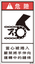 TOP中国語ラベル (繁体) 巻き込まれ Mサイズ (90×50) ZH-2211-M 巻込まれ(90×50) 価格: ¥210 (税込 ¥231) 販売期間: 型番: ZH-2211-M 数量: 枚 在庫 在庫あり 日本語訳 巻き込まれ注意回転中のチェーンに手を出すな 商品説明 PET樹脂製の警告ラベルです。表面はラミネート加工です。 商品仕様 製品名: 警告ラベル 繁体語 型番: ZH-2211-M 外寸法: 幅50mm × 高さ90mm 製品重量: 2g ・RoHS(10種)対応 / REACH対応 ・屋外/屋内対応 ・スクリーン印刷 ・耐熱性 -20℃〜80℃ ・耐油性 ギヤ油72時間変化なし ・耐候性 ウェザーメーター 400時間変化なし