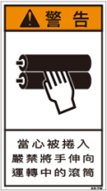 TOP中国語ラベル (繁体) 巻き込まれ Mサイズ (90×50) ZH-305-M 巻込まれ(90×50) 価格: ¥210 (税込 ¥231) 販売期間: 型番: ZH-305-M 数量: 枚 在庫 在庫あり 日本語訳 巻き込まれ注意回転中のローラーに手を出すな 商品説明 PET樹脂製の警告ラベルです。表面はラミネート加工です。 商品仕様 製品名: 警告ラベル 繁体語 型番: ZH-305-M 外寸法: 幅50mm × 高さ90mm 製品重量: 2g ・RoHS(10種)対応 / REACH対応 ・屋外/屋内対応 ・スクリーン印刷 ・耐熱性 -20℃〜80℃ ・耐油性 ギヤ油72時間変化なし ・耐候性 ウェザーメーター 400時間変化なし