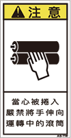 TOP中国語ラベル (繁体) 巻き込まれ Sサイズ (61×31) ZH-315-S 巻込まれ(61×31) 価格: ¥160 (税込 ¥176) 販売期間: 型番: ZH-315-S 数量: 枚 在庫 在庫あり 日本語訳 巻き込まれ注意回転中のローラーに手を出すな 商品説明 PET樹脂製の警告ラベルです。表面はラミネート加工です。 商品仕様 製品名: 警告ラベル 繁体語 型番: ZH-315-S 外寸法: 幅31mm × 高さ61mm 製品重量: 1g ・RoHS(10種)対応 / REACH対応 ・屋外/屋内対応 ・スクリーン印刷 ・耐熱性 -20℃〜80℃ ・耐油性 ギヤ油72時間変化なし ・耐候性 ウェザーメーター 400時間変化なし
