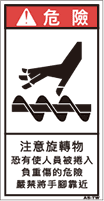 TOP中国語ラベル (繁体) 巻き込まれ Sサイズ (61×31) ZH-327-S 巻込まれ(61×31) 価格: ¥160 (税込 ¥176) 販売期間: 型番: ZH-327-S 数量: 枚 在庫 在庫あり 日本語訳 回転物注意巻き込まれ重傷の恐れあり手足を近づけるな 商品説明 PET樹脂製の警告ラベルです。表面はラミネート加工です。 商品仕様 製品名: 警告ラベル 繁体語 型番: ZH-327-S 外寸法: 幅31mm × 高さ61mm 製品重量: 1g ・RoHS(10種)対応 / REACH対応 ・屋外/屋内対応 ・スクリーン印刷 ・耐熱性 -20℃〜80℃ ・耐油性 ギヤ油72時間変化なし ・耐候性 ウェザーメーター 400時間変化なし
