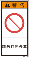 TOP中国語ラベル (繁体) 禁止 Sサイズ (61×31) ZH-608-S 禁止(61×31) 価格: ¥160 (税込 ¥176) 販売期間: 型番: ZH-608-S 数量: 枚 在庫 在庫あり 日本語訳 カバーを外すな 商品説明 PET樹脂製の警告ラベルです。表面はラミネート加工です。 商品仕様 製品名: 警告ラベル 繁体語 型番: ZH-608-S 外寸法: 幅31mm × 高さ61mm 製品重量: 1g ・RoHS(10種)対応 / REACH対応 ・屋外/屋内対応 ・スクリーン印刷 ・耐熱性 -20℃〜80℃ ・耐油性 ギヤ油72時間変化なし ・耐候性 ウェザーメーター 400時間変化なし