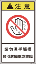 TOP中国語ラベル (繁体) 禁止 Mサイズ (90×50) ZH-616-M 禁止(90×50) 価格: ¥210 (税込 ¥231) 販売期間: 型番: ZH-616-M 数量: 枚 在庫 在庫あり 日本語訳 濡れた手で触るな感電や故障の原因になる 商品説明 PET樹脂製の警告ラベルです。表面はラミネート加工です。 商品仕様 製品名: 警告ラベル 繁体語 型番: ZH-616-M 外寸法: 幅50mm × 高さ90mm 製品重量: 2g ・RoHS(10種)対応 / REACH対応 ・屋外/屋内対応 ・スクリーン印刷 ・耐熱性 -20℃〜80℃ ・耐油性 ギヤ油72時間変化なし ・耐候性 ウェザーメーター 400時間変化なし