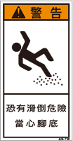 TOP中国語ラベル (繁体) その他 Sサイズ (61×31) ZH-807-S その他(61×31) 価格: ¥160 (税込 ¥176) 販売期間: 型番: ZH-807-S 数量: 枚 在庫 在庫あり 日本語訳 滑る恐れあり足元に注意 商品説明 PET樹脂製の警告ラベルです。表面はラミネート加工です。 商品仕様 製品名: 警告ラベル 繁体語 型番: ZH-807-S 外寸法: 幅31mm × 高さ61mm 製品重量: 1g ・RoHS(10種)対応 / REACH対応 ・屋外/屋内対応 ・スクリーン印刷 ・耐熱性 -20℃〜80℃ ・耐油性 ギヤ油72時間変化なし ・耐候性 ウェザーメーター 400時間変化なし