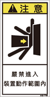 TOP中国語ラベル (繁体) その他 Sサイズ (61×31) ZH-812-S その他(61×31) 価格: ¥160 (税込 ¥176) 販売期間: 型番: ZH-812-S 数量: 枚 在庫 在庫あり 日本語訳 装置動作範囲内立ち入り禁止 商品説明 PET樹脂製の警告ラベルです。表面はラミネート加工です。 商品仕様 製品名: 警告ラベル 繁体語 型番: ZH-812-S 外寸法: 幅31mm × 高さ61mm 製品重量: 1g ・RoHS(10種)対応 / REACH対応 ・屋外/屋内対応 ・スクリーン印刷 ・耐熱性 -20℃〜80℃ ・耐油性 ギヤ油72時間変化なし ・耐候性 ウェザーメーター 400時間変化なし