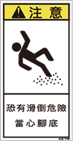 TOP中国語ラベル (繁体) その他 Sサイズ (61×31) ZH-817-S その他(61×31) 価格: ¥160 (税込 ¥176) 販売期間: 型番: ZH-817-S 数量: 枚 在庫 在庫あり 日本語訳 滑る恐れあり足元に注意 商品説明 PET樹脂製の警告ラベルです。表面はラミネート加工です。 商品仕様 製品名: 警告ラベル 繁体語 型番: ZH-817-S 外寸法: 幅31mm × 高さ61mm 製品重量: 1g ・RoHS(10種)対応 / REACH対応 ・屋外/屋内対応 ・スクリーン印刷 ・耐熱性 -20℃〜80℃ ・耐油性 ギヤ油72時間変化なし ・耐候性 ウェザーメーター 400時間変化なし