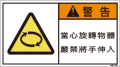 TOP中国語ラベル (繁体) 巻き込まれ Mサイズ (90×50) ZW-257-M 巻込まれ(90×50) 価格: ¥210 (税込 ¥231) 販売期間: 型番: ZW-257-M 数量: 枚 在庫 在庫あり 日本語訳 回転物注意手を入れるな 商品説明 PET樹脂製の警告ラベルです。表面はラミネート加工です。 商品仕様 製品名: 警告ラベル 繁体語 型番: ZW-257-M 外寸法: 幅90mm × 高さ50mm 製品重量: 2g ・RoHS(10種)対応 / REACH対応 ・屋外/屋内対応 ・スクリーン印刷 ・耐熱性 -20℃〜80℃ ・耐油性 ギヤ油72時間変化なし ・耐候性 ウェザーメーター 400時間変化なし